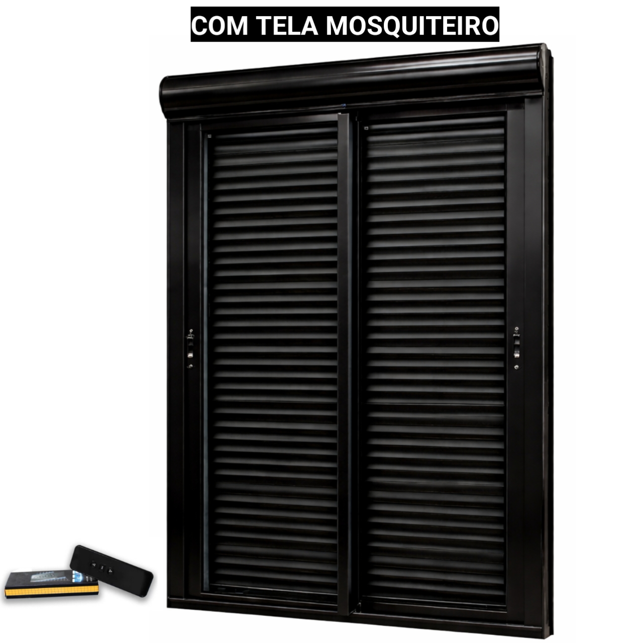 PORTA COM PERSIANA INTEGRADA 2 FOLHAS MÓVEIS COM FECHO CONCHA ACIONAMENTO AUTOMÁTICO POR CONTROLE REMOTO (110v) COM TELA MOSQUITEIRO DE CORRER - MODELO PCR.TL